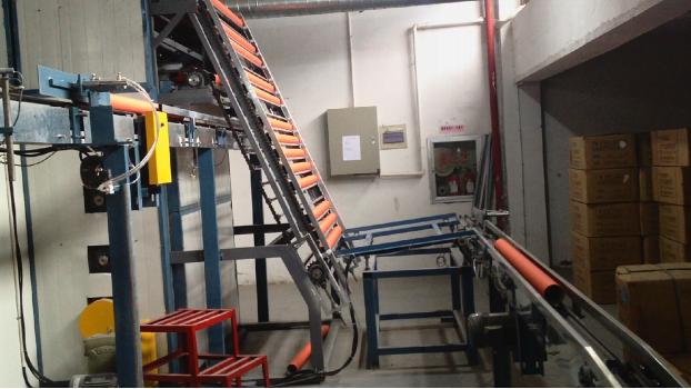 2、流水線烘房由紙管機(jī)卷管后的紙管通過(guò)輸送帶自動(dòng)進(jìn)入預(yù)烘區(qū),經(jīng)過(guò)預(yù)烘后增強(qiáng)了紙張的黏合,去除部分水分使紙管有一定的強(qiáng)度,便于紙管卷邊(彎邊)時(shí)不變形不開(kāi)裂,自動(dòng)輸送、進(jìn)烘廂、出烘廂,進(jìn)后段加工,除濕、烘干、溫度檢測(cè)、故障檢測(cè)、報(bào)警提示等全自動(dòng)化,無(wú)須人員看管。紙管緩緩滾動(dòng)、逐步烘干,高強(qiáng)熱風(fēng)正反向循環(huán)從紙管內(nèi)外腔流動(dòng),合適均勻的溫度控制, 避免了老式烘房紙管由于固定成堆的放置,風(fēng)力、溫度分布不均造成的尺寸變形,水份不勻等缺陷。