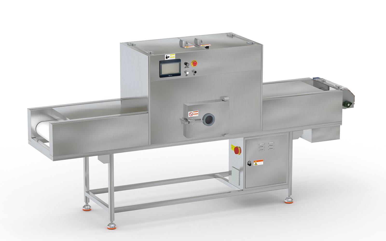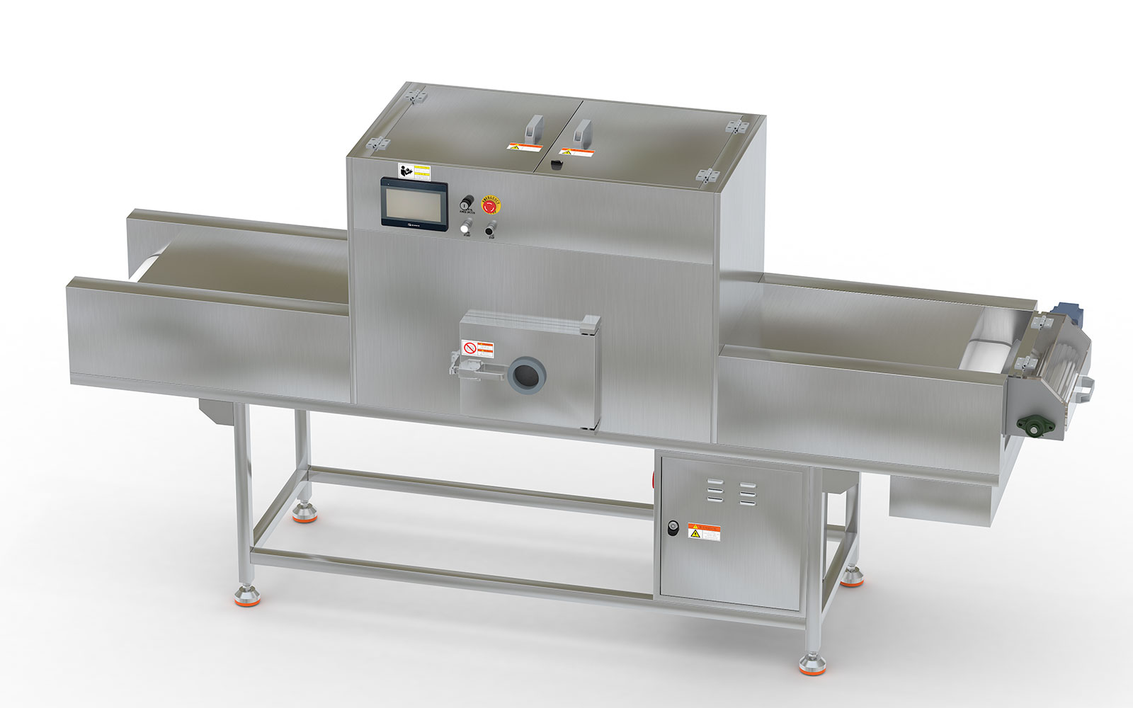 3、箱體門與箱體底板為無臺階設(shè)計,方便物料的清理;安裝視窗,方便觀察物料運行狀態(tài),并設(shè)有開門自動斷電保護裝置。